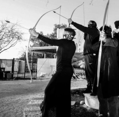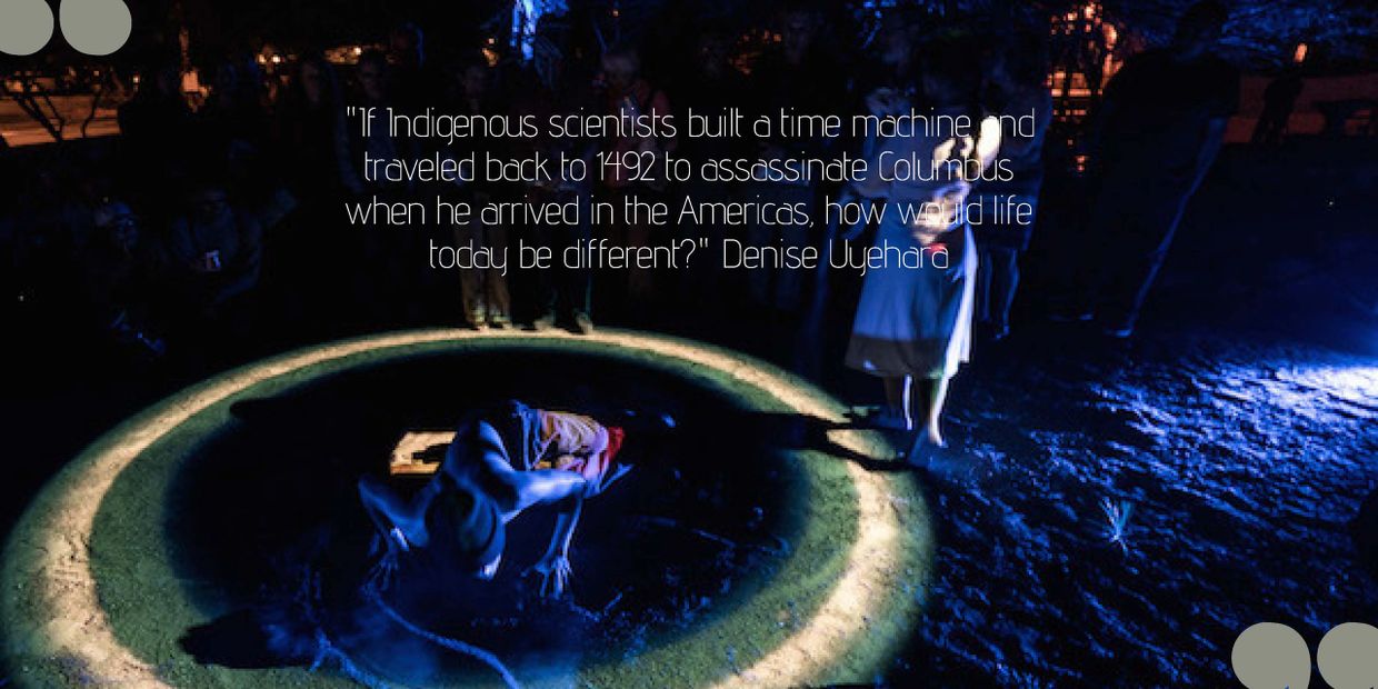 “Shooting Columbus,” a collaborative piece by the Fifth World Collective, made up almost entirely of indigenous people, is a time-traveling piece that wants us to see what possibilities existed if Christopher Columbus had never brought his ships to these shores. The land along Arizona’s Southern border would not be divided by a wall that prevents the Tohono O’Odham from traveling to important spiritual ceremonies. The Black Mesa plateau that runs across Navajo and Hopi lands in the Four Corners area would still be sacred burial grounds and be lush and livable with clean water because the Peabody Coal Mine would never have come in to destroy the land and break promises. And languages and customs would thrive because generations of indigenous children would never have been forced to go to Indian boarding schools where they were not allowed to speak their language, dance their dances or wear their hair in the customary braids. That cutting of the braids, one man says in a recording, “was like an invisible pain.”